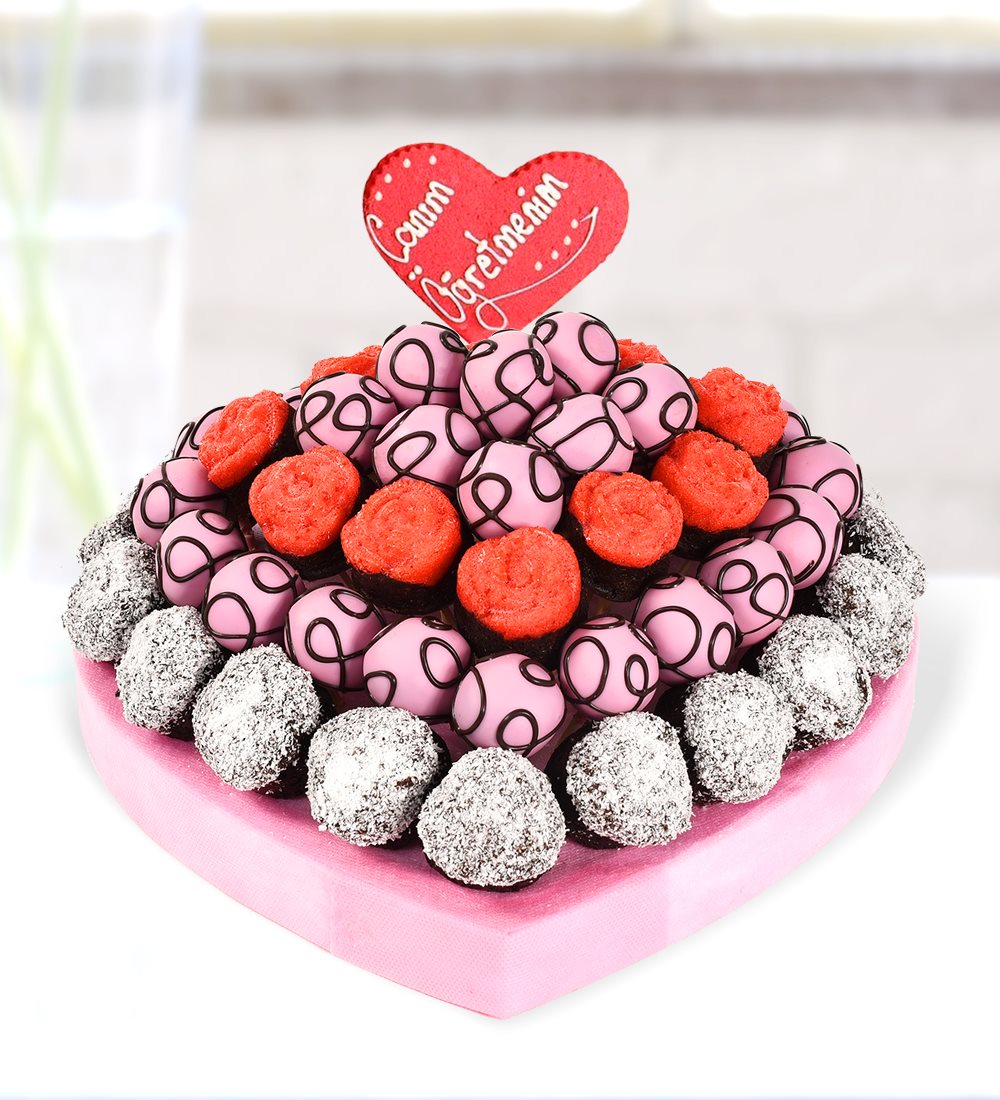 Ürünümüzde yaklaşık olarak 16 adet çikolata ve hindistan cevizli browni kek, 28 adet frambuaz çikolatalı Lezzet Topu, 11 adet kırmızı gül kek, 1 adet mesaj kurabiyesi bulunmaktadır. Strafor çapı 30 cm dir.