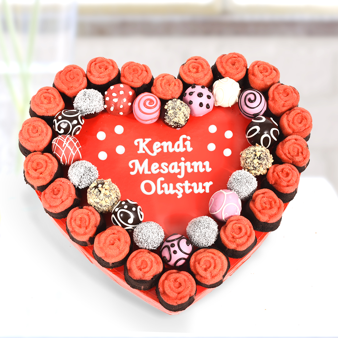Ürünümüzde yaklaşık olarak, 19 adet çikolatalı karışık Lezzet Topu, 22 adet gül kek bulunmaktadır. Strafor çapı yaklaşık olarak 30 cm’dir.