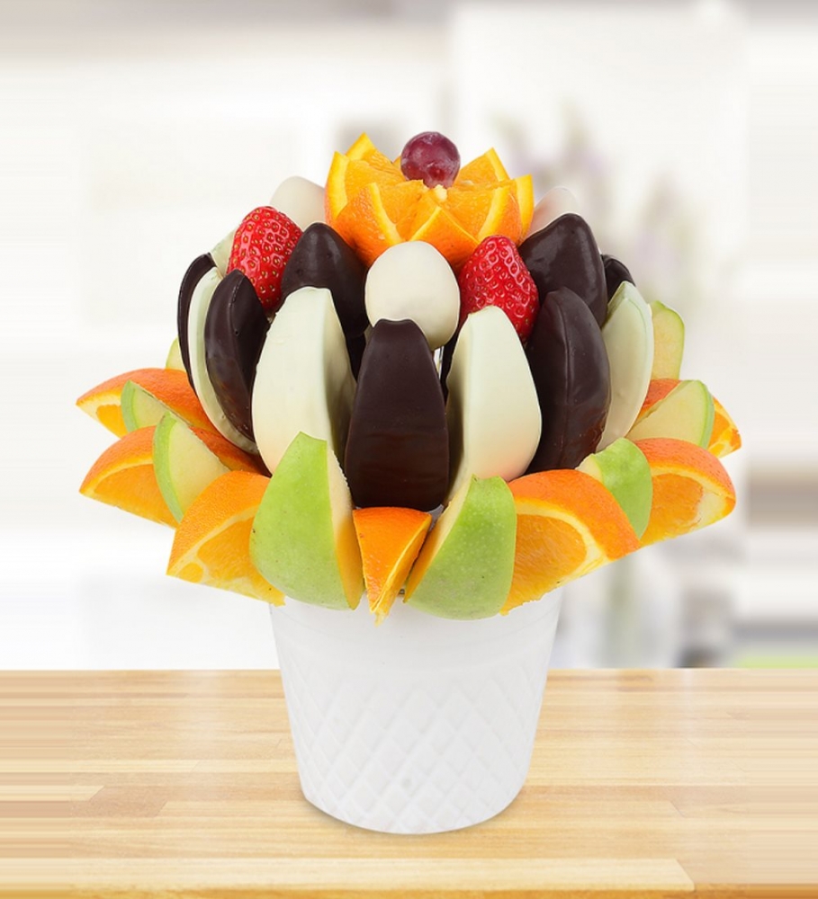 Özel günlerinizde ve en özel anlarınızda sevdiklerinize hediye edebileceğiniz lezzet dolu hediyelik meyve sepeti ürünleri ile en güzel anlarınızı tatlandırın... Ürünümüzde yaklaşık olarak 10 adet sade elma dilim, 10 adet portakal dilim, 14 adet çikolata kaplı elma dilim, 1 adet yildiz portakal, 3 adet fresh çilek, 6 adet çikolata kaplı çilek, 1 adet üzüm tanesi bulunmaktadır. Adetler meyvelerin boyutuna göre değişiklik gösterebilmektedir. Saksı rengi stok durumuna göre değişiklik gösterebilir. Saksı çapı 12cm, yüksekliği 10cm ‘ dir.